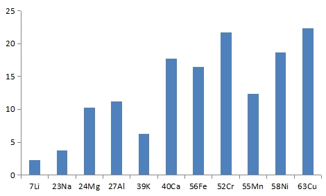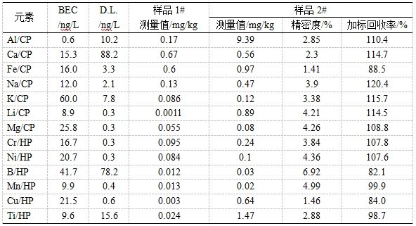 參考《GB/T 32650-2016 電感耦合等離子體質譜法檢測石英砂中痕量元素》進行樣品前處理。利用冷焰模式及標準模式對樣品進行測試,考察背景等效濃度(BEC)、方法檢出限(D.L.)、加標回收率、精密度。背景等效濃度在0.6ng/L~60.0ng/L之間,方法檢出限在0.3ng/L~88.2ng/L之間,加標回收率在82.1%~120.4%之間,精密度在1.41%~6.92%之間。