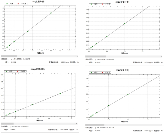 冷焰模式下,繪制各元素0,0.05,0.1,0.2,0.5,1.0μg/L系列濃度標液工作曲線,39K、40Ca、56Fe等同位素的線性相關系數r均大于0.999,背景等效濃度為0.0023μg/L~0.0217μg/L。