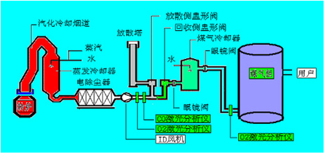 如圖2可見,在回收側盅形閥/分散側盅形閥前布設煙氣在線分析儀,只有當通過CO在線監(jiān)測系統(tǒng)測得轉爐煤氣中的CO濃度在30%以上時,才打開氣體切換站的回收側盅形閥進入煤氣柜儲存,否則通過分散側盅形閥通過放散塔點火燃燒。在煤氣柜前布設煙氣在線分析儀,只有在線監(jiān)測系統(tǒng)測分析保證煤氣柜內(nèi)O2含量不會超標(控制在1%以下)才允許焦煤煤氣進入煤氣柜,否則啟動停止回收,以保證系統(tǒng)的穩(wěn)定性和安全性。