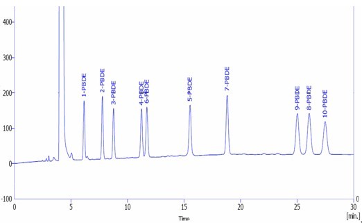 盟議會和理事會于2003年1月通過了RoHS指令,全稱是The Restriction of the use of certain Hazardous substances in Electnical and Electronic Equipment,即在電子電氣設備中限制使用某些有害物質指令,也稱2002/95/EC指令,2005年歐盟又以2005/618/EC決議的形式對2002/95/EC進行了補充,明確了六種有害物質的最大限量值,這六種物質分別為:鉛Pb、鎘Cd、汞Hg、六價鉻Cr6+、,多溴聯苯醚PBDE,多溴聯苯PBB。世界各國尤其是發達國家,對RoHS指令的出臺反響強烈,高度關注;中國是全球制造業大國,也是產品出口大國,出口總量的70%以上涉及到RoHS指令,因此中國政府亦十分重視相關問題,并于2004年出臺了《電子信息產品污染防治管理辦法》,內容類似RoHS指令,并準備與其同步實施。作為該指令中的多溴聯苯醚類有害物質----溴化阻燃劑,被廣泛用于多種消費品中,包括電子產品、紡織品、家具、日化、玩具等,這些物質的存在,一方面避免產品起燃,確保人類生活安全,然而另一方面,由于該類物質在生產和回收中多有殘留,也已影響到人類的生活健康,這也是該指令頒布的初衷。針對該指令中多溴聯苯醚溴系阻燃劑的測定,國家公認的檢測方法有GC/MS、GC/FID、GC/ECD、HPLC/MS/MS、 HPLC/UV以及紅外光譜法等,然而GC/MS、HPLC/MS/MS儀器價格昂貴,對人員的專業素質要求高,對用戶來說,普及率不高,尤其是中小型企業相對難度加大,而GC/FID、GC/ECD、HPLC/UV均只對部分多溴聯苯醚進行分離。本文在HPLC/UV的基礎上進一步優化,提出了一種方法簡便、快速、準確、靈敏度高、適應性好、回收率高,可用于工廠質量控制和檢驗機構樣品檢驗的方法。