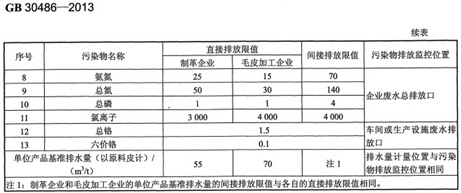 《制革及皮毛加工工業水污染物排放標準》(GB30486-2013)中明確規定了,制革及毛皮加工企業水污染物排放值、監測和監控要求,以及標準的實施和監督等相關規定,其中2014年3月1日后新建企業其污水中總鉻的排放標準為1.5mg/L,六價鉻的排放標準為0.1mg/L,其排放監控位置為車間或生產設施廢水排放口;2014年3月1日前已有企業其污水中總鉻的排放標準為1.5mg/L,六價鉻的排放標準為0.2mg/L,其排放監控位置為車間或生產設施廢水排放口;2016年1月1日后,所有企業均按新建企業標準執行。