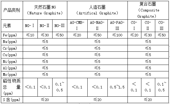 表1:不同類別的鋰離子電池石墨類負極材料的元素含量限定技術指標