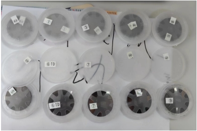 按照石墨取樣標準,取100g石墨樣品,在105℃的干燥箱干燥2h。稱量10.0g石墨樣品和2.0g硬脂酸(分析純)于粉碎機中振動研磨30s,將石墨樣品粉碎至0.074mm及以下。稱量3.0g石墨樣品和12.0g硼酸粉末,以硼酸粉末為填充劑,在30T壓力保壓30s的條件下壓片成型。然后,在樣片上面貼上標簽、放入樣品袋中,待用。
