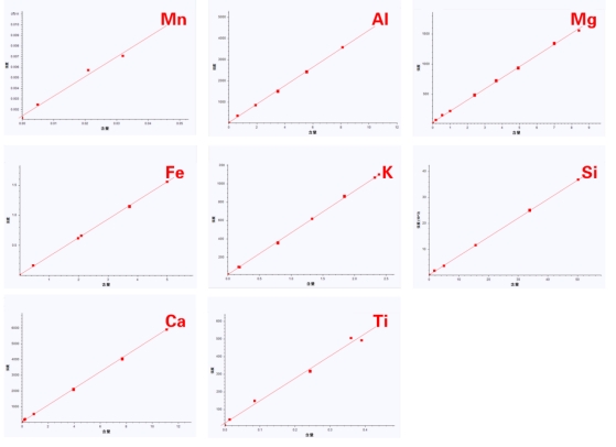 設定適當?shù)臏y量條件,使用X射線熒光光譜儀掃描一系列含量已知的石墨標準物質或石墨二次標樣,該系列樣品中需關注元素Mg、Al、Si、K、Ca、Ti、Mn、Fe等元素含量與強度的一次線性校正工作曲線。然后,對未知石墨樣品進行測量。