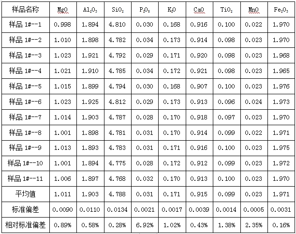 圖3為石墨1#樣品的X射線熒光譜圖,從譜圖可知,樣品的含有少量Mg、Al、Si、P、K、Ca、Ti、Mn、Fe等元素。使用該樣品進行重復性測試之后,檢測結果中計算了對應元素的氧化物含量,測試結果中呈現(xiàn)出較好的重復性。