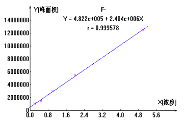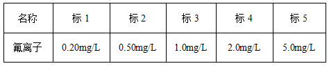 依次用移液槍移取氟離子標準溶液(1000mg/L)0.02mL、0.05mL、0.1mL、0.2mL、0.5mL分別于5個100mL的容量瓶中,用超純水定容至刻度并搖勻,各標準曲線的濃度詳見表1,氟離子的曲線方程及線性如圖2所示。