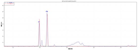 目標物在0.5ppm-10ppm線性良好。取空白塑膠樣品加標,樣品經過正己烷超聲萃取。10ppm加標水平(圖5),得到比較滿意的效果。
