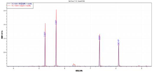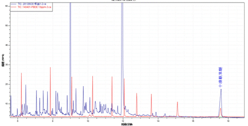 樣品TIC圖(藍色)與多溴聯(lián)苯醚混標TIC圖(紅色)