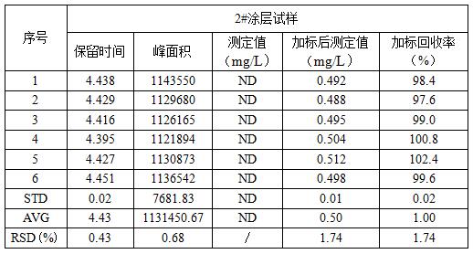 隨機抽取2#涂層試樣進行加標0.5mg/L重復測定6次,考察了保留時間、峰面積的重復性及加標回收率,其中保留時間的重復性(RSD)為0.43%,峰面積的重復性(RSD)為0.68%,加標回收率的重復性(RSD)為1.74%,測試結果詳見表3所示。
